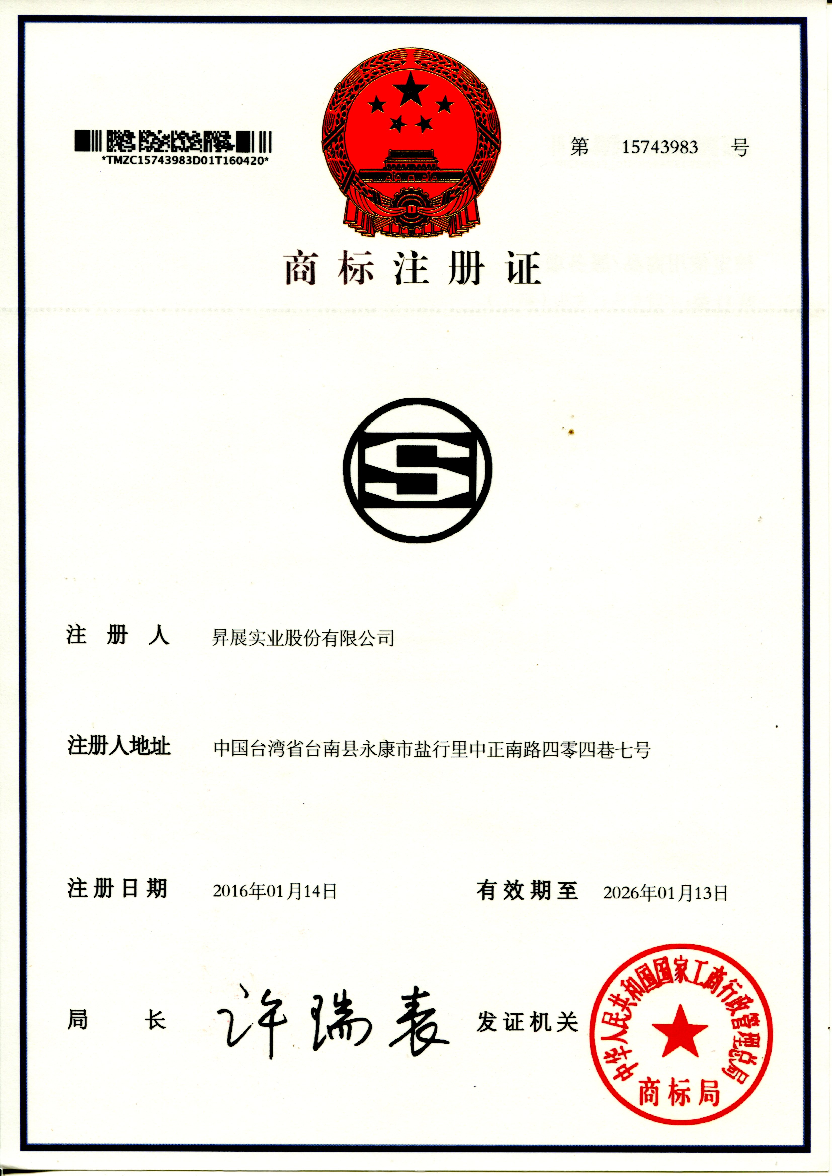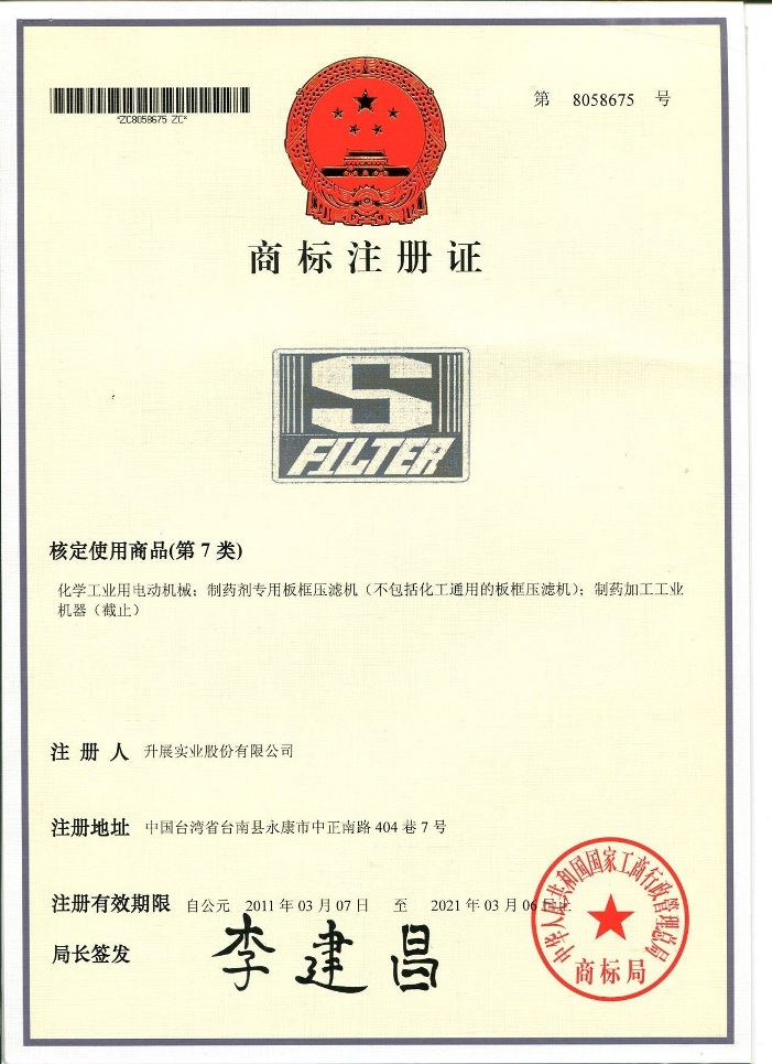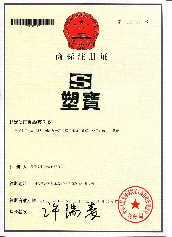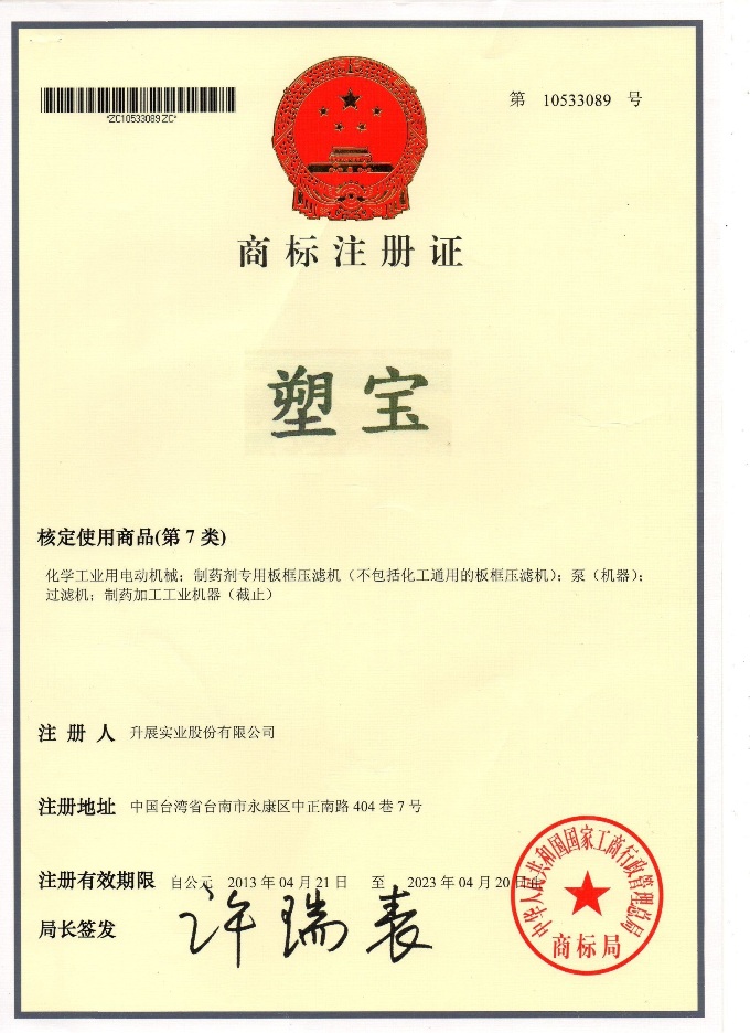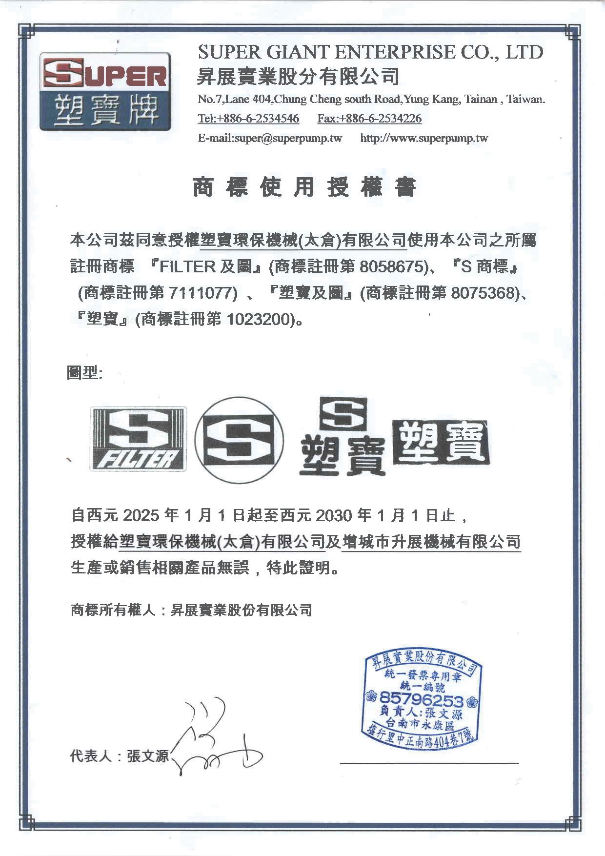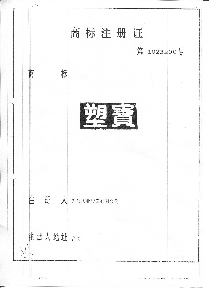 下列各式商標(biāo)為本公司于大陸取得之商標(biāo)注冊,僅授權(quán)太倉市塑寶環(huán)保機(jī)械及增城市升展機(jī)械公司使用,其余非經(jīng)我司書面許可而濫用者,本公司將采取法律行動,追索侵權(quán)之損害賠償。